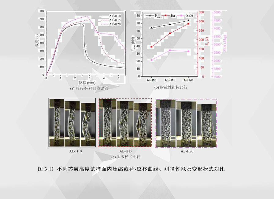 從其耐撞性指標(biāo)圖3.11(b)中可以看出,鋁合金夾層結(jié)構(gòu)的峰值載荷及總吸能隨芯層高度的增加而增加,而其比吸能的變化趨勢則不然。當(dāng)夾層結(jié)構(gòu)的芯層高度從10mm增加到15mm,試件在第三階段的主要失效模式由整體屈曲變?yōu)槊姘迩緦悠茐姆绞揭舶l(fā)生了變化,由于后者的失效模式吸收的能量比前者多很多,所以即使結(jié)構(gòu)的重量有所增加,但AL-H15的比吸能(SEA)仍比AL-H10高。而當(dāng)夾層結(jié)構(gòu)的芯層厚度從15mm增加到20mm時,試件在第二、三階段的主要失效模式基本未發(fā)生變化,雖說后者在第三階段的吸能會更多一些,但畢竟總吸能提高的幅度有限,所以AL-H15比AL-H20的比吸能(SEA)更高。
